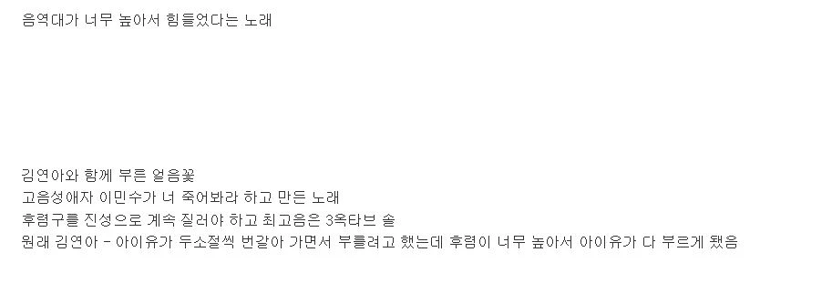 해당 글에 따르면 아이유는 음역대가 높아서 힘들었다는 노래로 김연아와 함께 부른 ‘얼음꽃’을 선정했다.