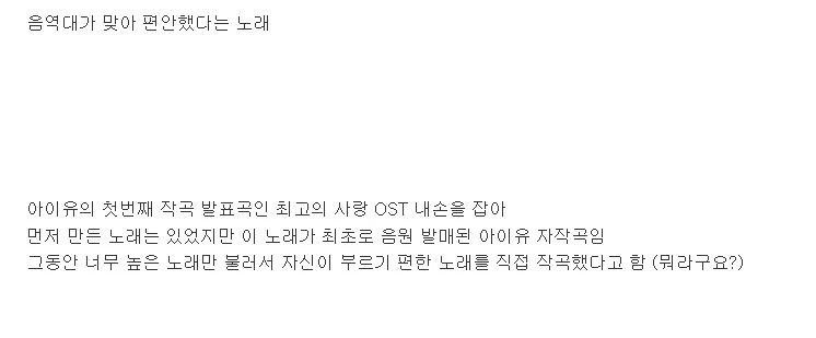 지난달 6일 온라인 커뮤니티에는 ‘아이유 피셜 음역대가 너무 높아서 힘든 노래 & 음역대가 맞아 편안했다는 노래’라는 제목의 글이 게재됐다.