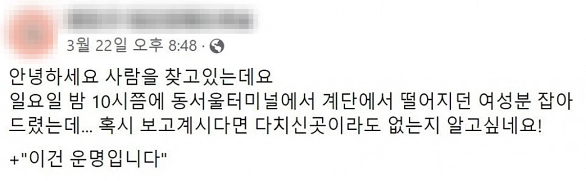 남성은 “안녕하세요. 사람을 찾고 있는데요. 일요일(3월 20일) 밤 10시쯤 동서울터미널 계단에서 떨어지던 여성분 잡아드렸는데 혹시 보고 계신다면 다친 곳 없는지 알고 싶네요. 이건 운명입니다”라고 글을 남겼다.