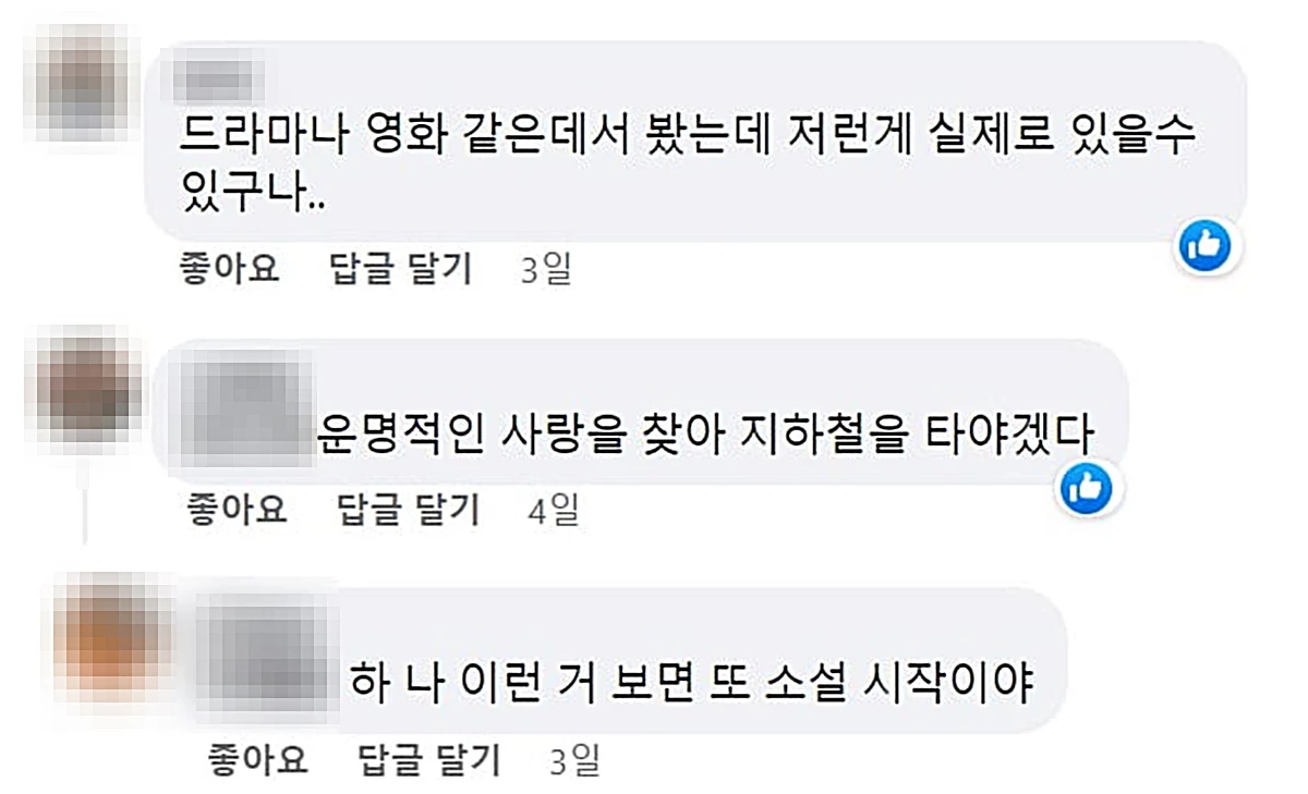 남성의 글을 본 다른 누리군들은 “드라마나 영화 같은 데서 봤는데 저런 게 실제로 있을 수 있구나”, “운명적인 사랑을 찾고 싶다” 등의 반응을 보였다.