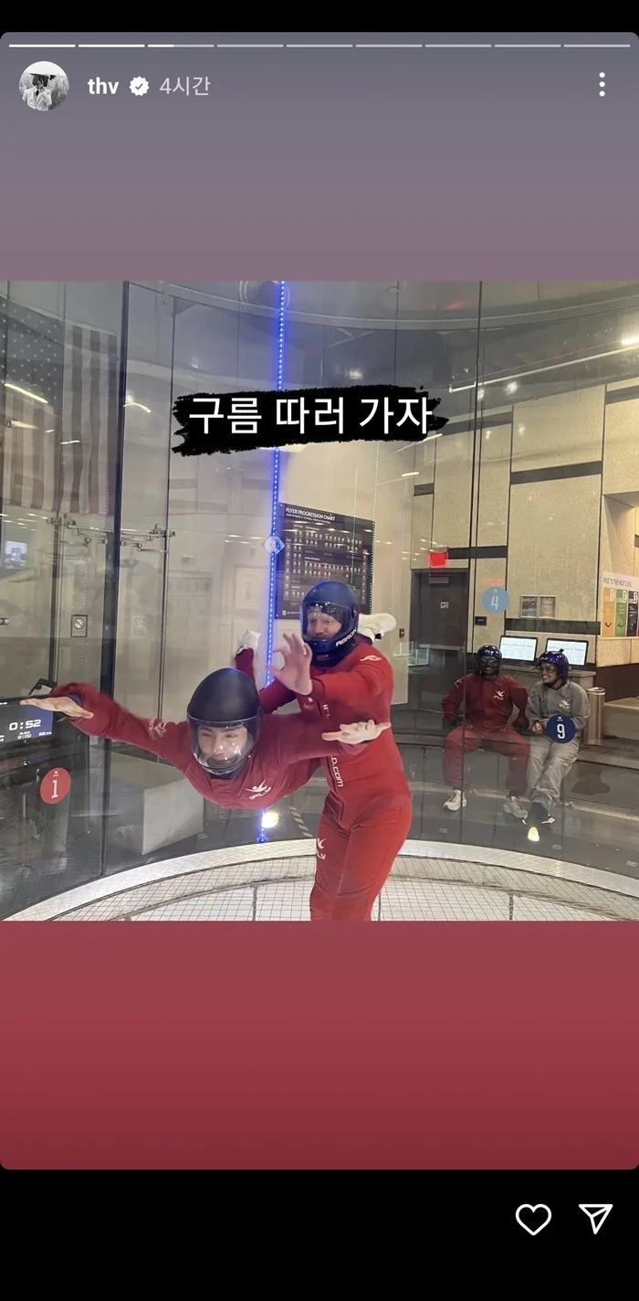 또 뷔는 “나도 저 위로.. 나도 멋진 거..”라는 글과 무중력 체험을 하는 모습이 담긴 자신의 영상을 올렸다.