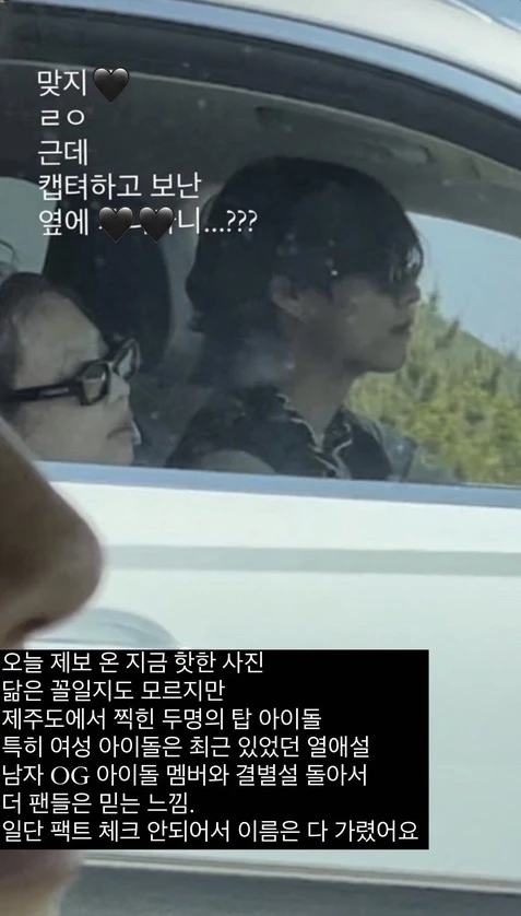 지난 22일 네이트 판 등 온라인 커뮤니티를 통해 뷔가 블랙핑크 제니로 추정되는 남녀가 제주도에서 함께 차 안에 있는 사진이 올라와 열애 중이란 의혹이 제기됐다.