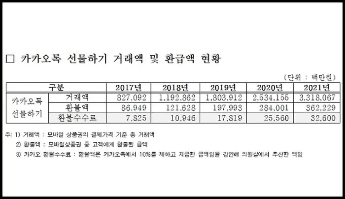 구자근 의원실이 카카오톡 선물하기 환불액을 역산해 추정한 결과 작년 환불 수수료 수익은 924억 원에 달한 것으로 전해졌다.