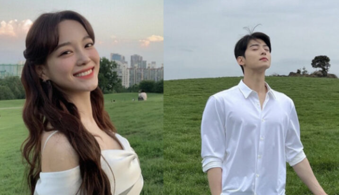 김세정과 차은우가 비슷한 시기에 잔디밭에서 찍은 사진이 공개돼 많은 네티즌들의 시선을 집중시켰다.