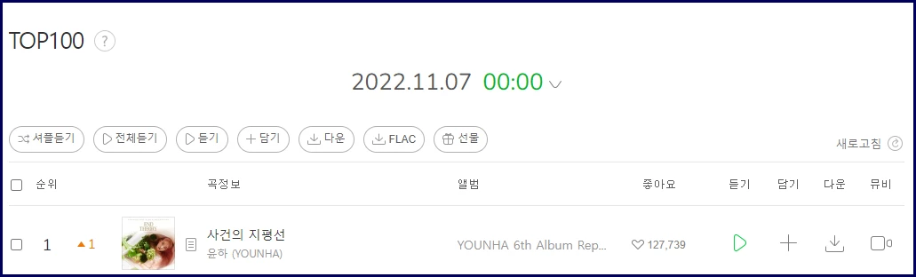 가수 윤하의 ‘사건의 지평선’이 역주행 끝에 7일 0시 기준 멜론 톱100 차트 1위를 기록하는 쾌거를 달성했다.
