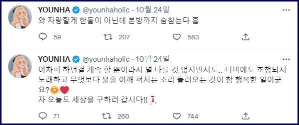 지난달 23일 ‘멜론 TOP 10’ 진입 소식을 들은 윤하는 트위터에 “어차피 하던 걸 계속할 뿐이라서 별다른 것 없지만 서도 TV에도 초청돼서 노래하고 무엇보다 우리 홀릭스(팬클럽) 어깨 펴지는 소리 들려오는 것이 참 행복한 일이다. 오늘도 세상을 구하러 가자”고 감사를 전했다.