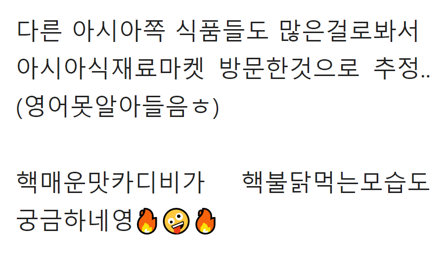 해당 게시글을 접한 누리꾼들은 “저 맛있을 수밖에 없는건 다 어케 알았대?! 한국인 친구있나”, “아 국뽕 차오른다”, “ㅋㅋㅋㅋ귀여워 카디비 언니ㅠㅠ”, “아니..언니 진심 맛잘알이잖아?”등의 다양한 반응을 보였다.