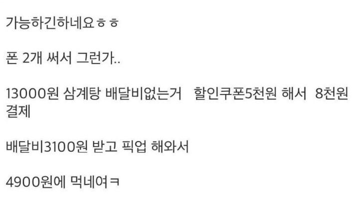 A씨는 “배달료가 없는 음식점에서 1만 3천 원짜리 삼계탕을 주문한 뒤 할인쿠폰 5천 원을 적용해 8천 원을 결제했다”고 설명했다. 그런다음 그는 다른 핸드폰으로 해당 음식점 콜을 받고 픽업해 배달비 3100원을 벌었다.