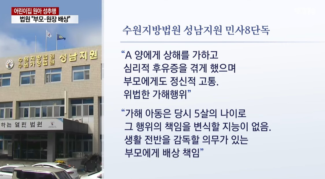 지난 2일 YTN은 일명 성남 어린이집 성x력 사건과 관련해 1심 판결 결과를 단독 보도했는데, 해당 보도에 따르면 재판부는 가해 아동 부모 및 어린이집 원장이 피해 아동 측에게 배상해야 한다고 봤다.