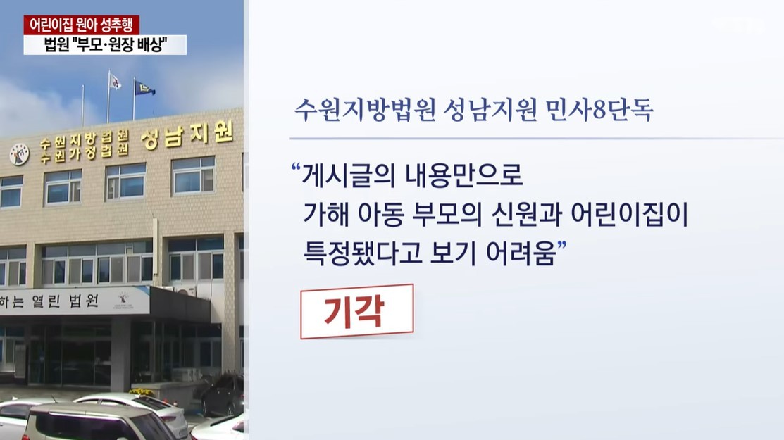 피해 아동 부모의 명예훼손 혐의에 대해선 기각됐는데. 어린이집을 특정하지도, 부모의 신원을 공개하지도 않아 명예훼손 기본 요건을 충족하지 않았다고 판결했다.