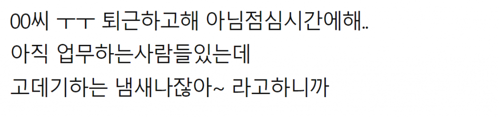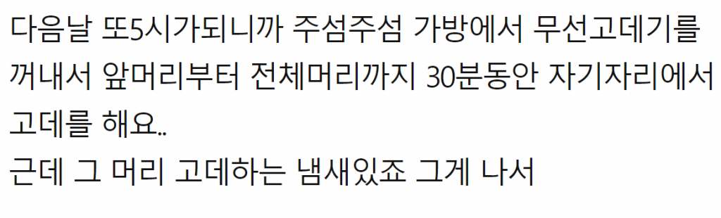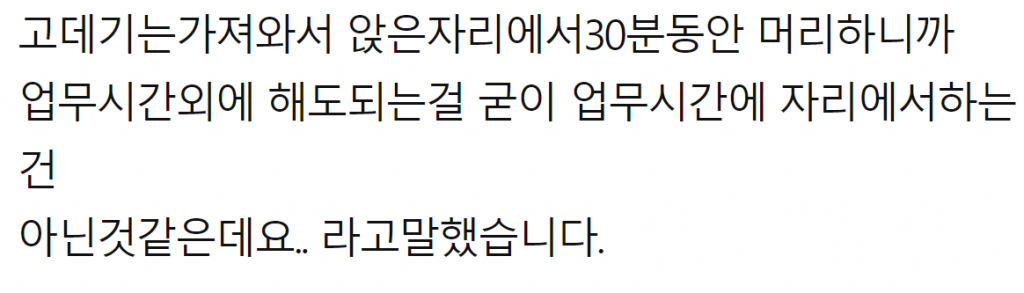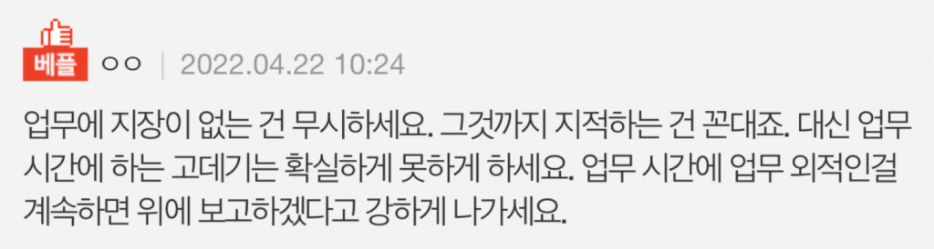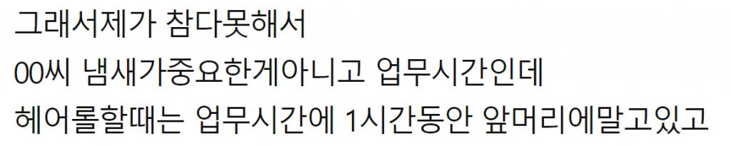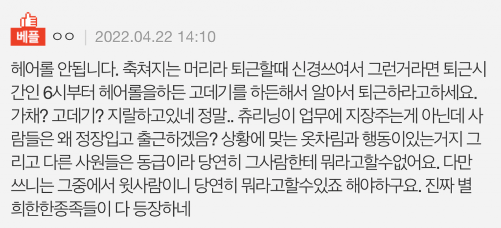 해당 사연을 접한 네티즌들은 “저게 어떻게 꼰대냐. 요즘 것들은 정말 개념이 없다”, “업무에 지장이 없는 건 그냥 무시해라”, “머리는 퇴근 시간 이후에 만지라고 해라”, “집에서 해야할 건 제발 집에서 해라” 등의 반응을 보였다.