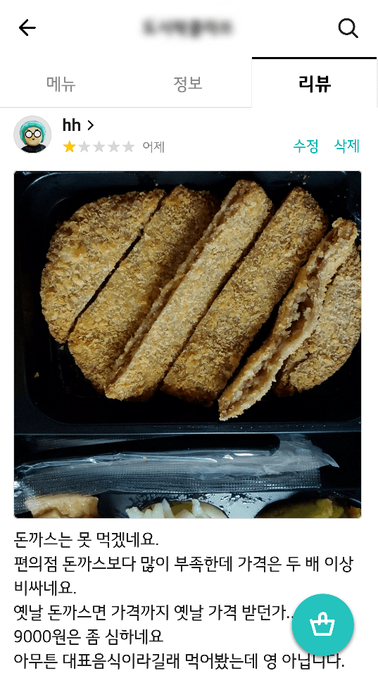 이 음식을 직접 시킨 A씨는 “돈까스는 못 먹겠다. 편의점 돈까스보다 많이 부족한데 가격은 두 배 이상 비싸다”고 지적했다.
