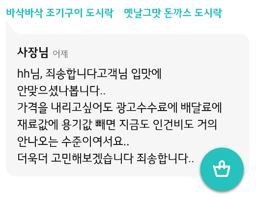 이에 사장님은 “죄송하다. 고객님 입맛에 안맞으셨나보다. 가격을 내리고 싶어도 광고수수료에 배달료에 재료값에 용기값 빼면 지금도 인건비도 거의 안나온다”고 토로했다.