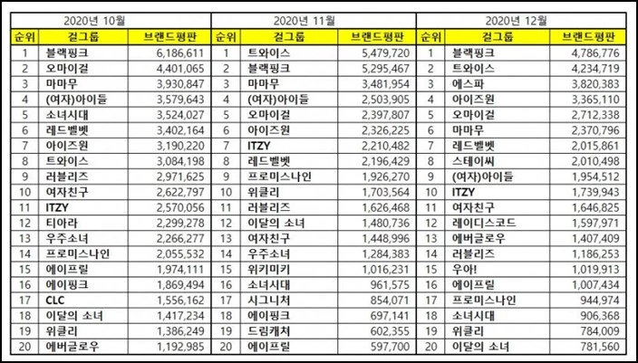 한국기업평판연구소는 11월 13일부터 12월 13일까지 측정한 브랜드 빅테이터를 분석한 걸그룹 순위를 공개했다.