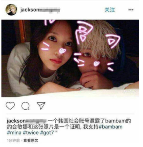 미나와 뱀뱀의 소속사 JYP 측에서는 침대 위에서 찍은 사진이 유출되자 이에 대해 ”연인이 아니라 친한 친구 사이”라고 발표했다.
