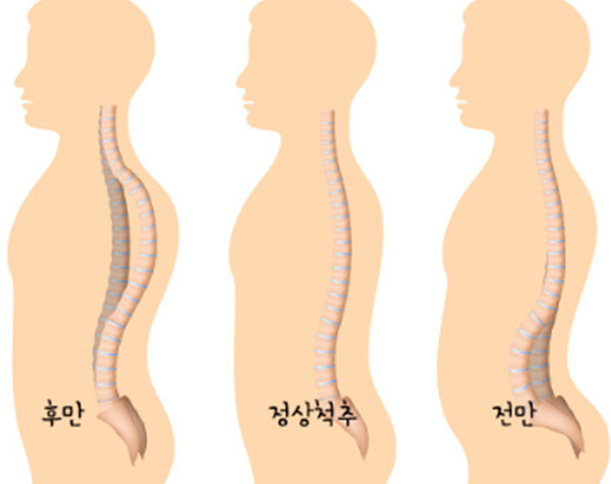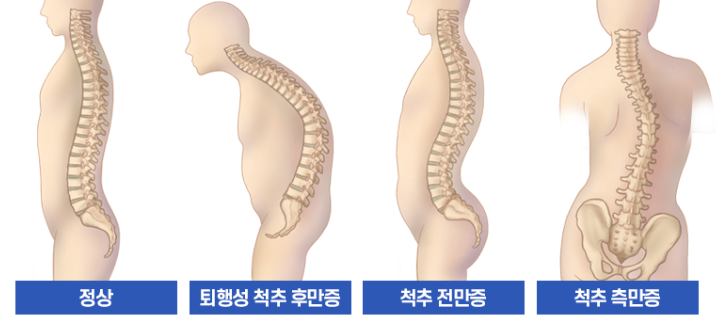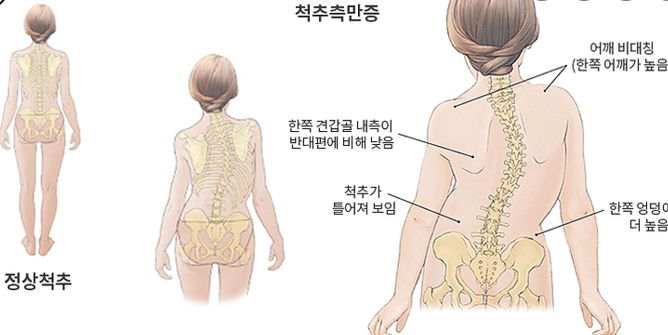 정면에서 봤을 땐 보통 직선으로 되어있지만 척추가 옆으로 휘어지는 경우가 있는데, 이를 척추측만증이라고 한다.