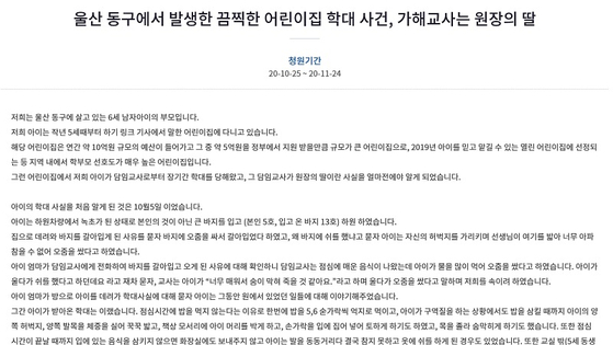 울산의 한 어린이집 교사의 아동 학대에 대해 피해 부모가 강력한 처벌을 요구하는 국민청원을 올렸다.