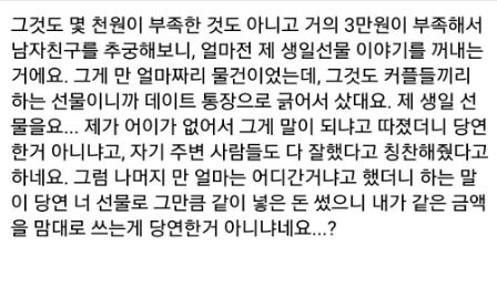 3. 데이트 통장에서 여친생일선물 사주고 그만큼 금액을 빼서 자기한테도 씀. 그래야 공평