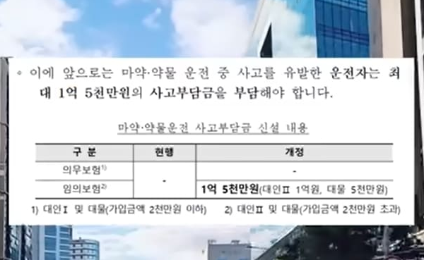 앞으로 마약, 약물 운전 중 사고를 유발한 운전자는 최대 1억 5천만 원의 사고부담금을 부담하게 된 것이다.