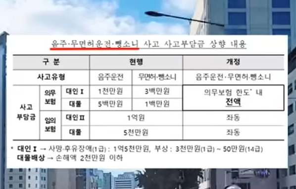 이와 관련해 음주, 무면허, 뺑소니 전부 의무보험 한도 내 전액을 사고부담금으로 내게 상향이 된 것으로 밝혔다.