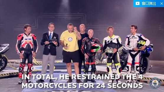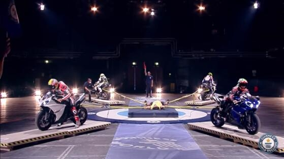 바로 4대에 오토바이를 손과 발에 연결한 다음 동시에 출발시켜 버티는 것이었다.