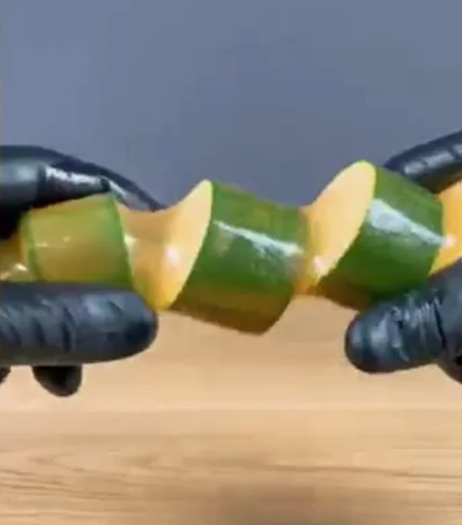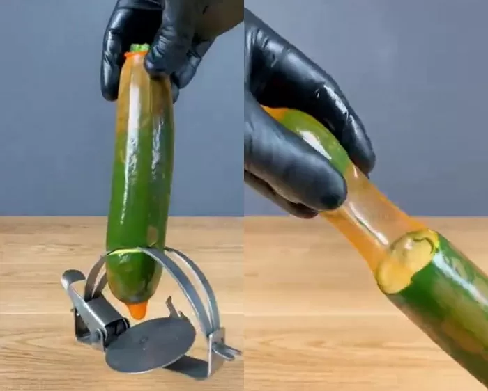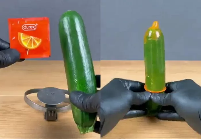 남성은 얇은 콘돔이 얼마나 내구성이 있는지 확인해보기 위해 직접 실험에 나섰는데, 그는 애호박(쥬키니)에 유명 회사의 콘돔을 씌우고 기계를 활용해 호박을 거침없이 잘랐다.