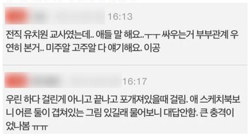 놀란 남편은 목욕탕으로 뛰어 들어갔고, 글쓴이는 “딸 왜 안 자고 왔어 잠이 안와?” 라고 묻자 아이는 ” 엄마 엄마가 왜 아빠 고추를 들고 아빠가 엄마를 붙잡아?” 라고 해맑게 물어보았다.