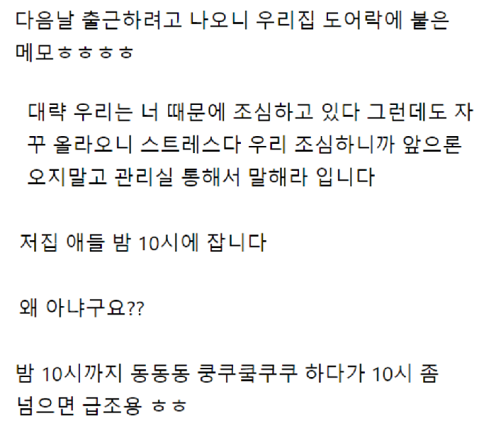 점점 더 심각해지자 A씨는 윗집에 “밤 10시까지 아이들 발소리가 너무 심하게 들립니다. 걸어다닐 때 슬리퍼 신고 조심히 걸어주세요. 부탁드립니다”는 내용의 메모를 윗집에 붙였다. 그러나 윗집 주민은 “아이들에게 계속 주의는 주고 있다”면서도 “오히려 스트레스가 이만저만이 아니다. 입주한 지 한달도 안돼서 계속 올라오니 너무 불편하다”고 말했다.