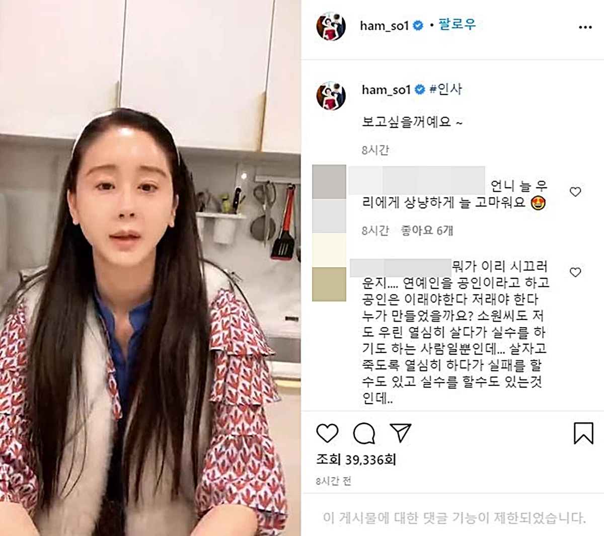 함소원은 “가끔 가다 여러분들이 너무 보고싶을 때 들어오겠다”며 “인사드릴 수 있는 날은 최대한 드리려고 해보겠다”고 밝혔다.
