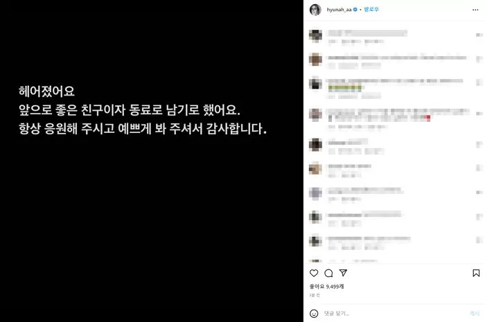30일 현아는 자신의 인스타그램을 통해 결별 했음을 밝혔다.