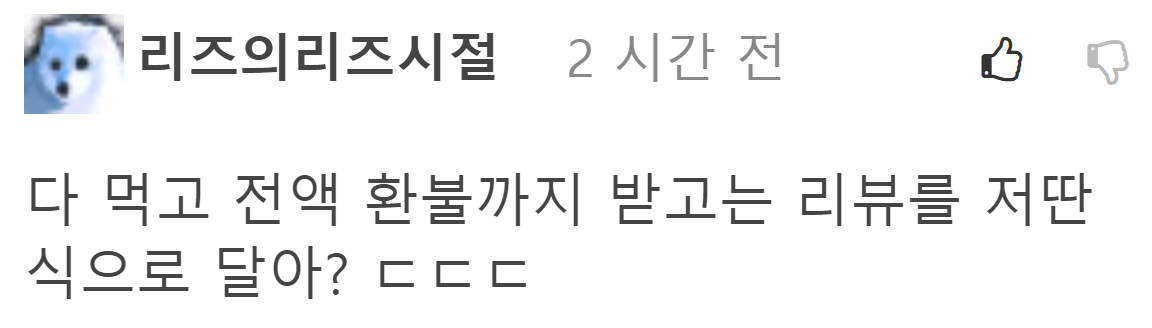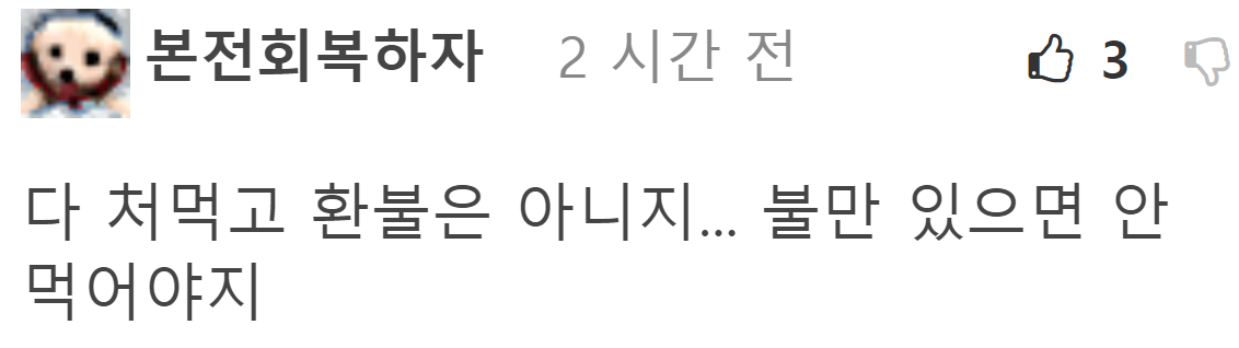 A씨의 게시물을 본 일부 네티즌은 “다 처먹고 환불은 아니지 … 불만 있으면 안먹어야지” 라 댓글을 남겼다.