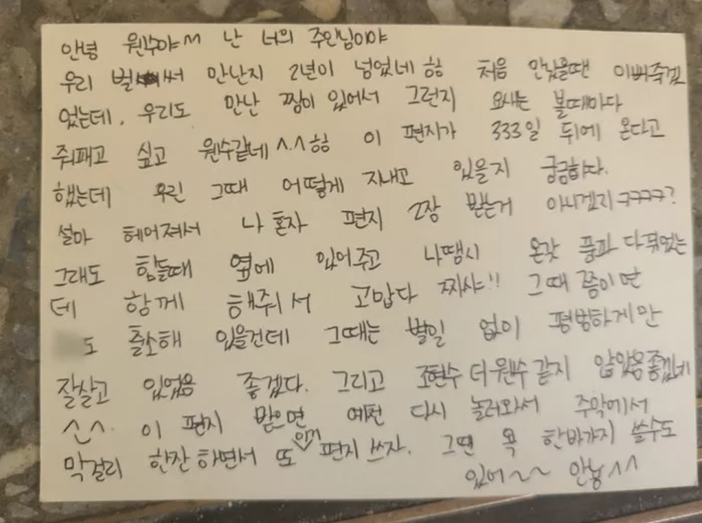 이씨는 엽서를 통해 조씨에게 “안녕, 웬수야(현수야) 난 너의 주인님이야, 우리 벌써 만난 지 2년이 넘었네 ㅎㅎ 처음 만났을 땐 이뻐죽겠었는데, 우리도 만난 짬이 있어서 그런지 요새는 볼 때마다 줘 패고 싶고 웬수같네”라고 적었다.