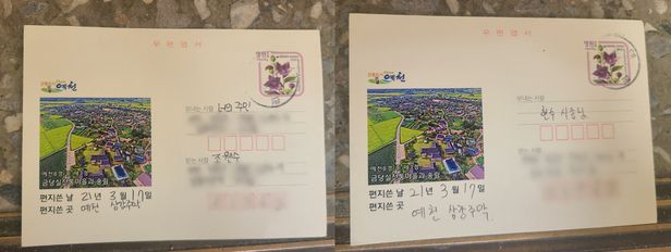 이 엽서는 2021년 3월 17일이씨와 조씨가 예천 삼강주막을 방문했을 당시, 333일 뒤에 엽서를 보내주는 ‘느린 우체통 서비스’를 통해 서로에게 쓴 것이다.
