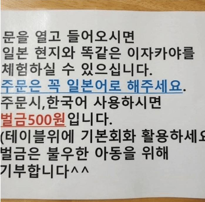 해당 이자카야의 안내문에는 ‘문을 열고 들어오시면 일본 현지와 똑같은 이자카야를 체험하실 수 있다. 주문은 꼭 일본어로 해달라‘는 요구가 쓰여있었다.