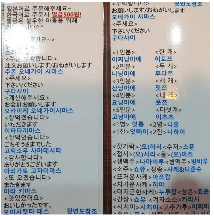 해당 이자카야 주인은 ‘테이블 위에 기본 회화 활용하라’며 ‘벌금은 불우한 아동을 위해 기부한다’고 벌금의 사용처를 안내문에 적어놨다.