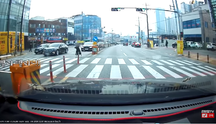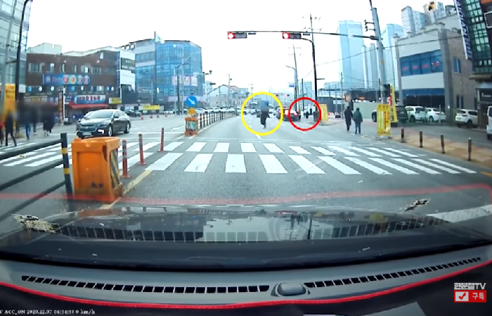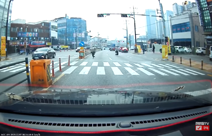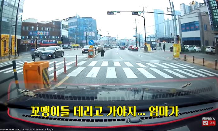 뒤늦게 아이들도 엄마를 따라 황급히 횡단보도에 올라섰다. 그러나 아이들이 중앙선쯤 왔을 때 이미 빨간불로 신호가 바뀌었다.