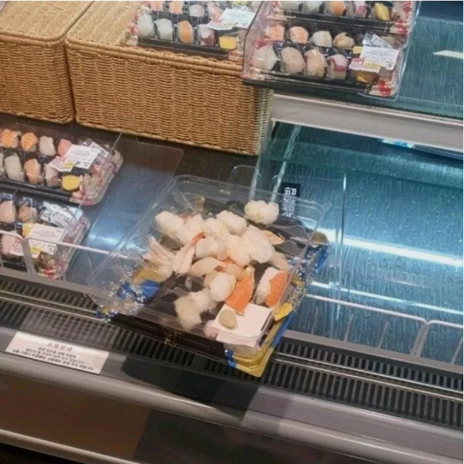 해당 사진을 보며 초밥은 난장판이 되어 제대로 판매할 수 없는 상태가 되었다.