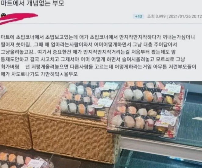 글에 내용에 따르면 마트 초밥 코너에서 초밥을 보고 있었는데 아이가 초밥을 만지작만지작 하더니 떨어져서 쏟아 졌다고 한다.
