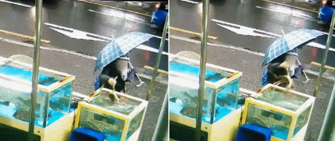 영상을 보면 점퍼를 입고 우산을 쓰고 걷고 있던 할머니는 한 수산물 식당 앞을 서성이면서 주변을 둘러보기 시작했다.