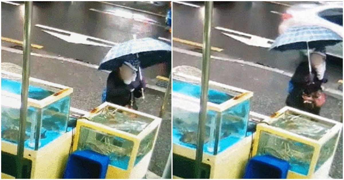 비 오는 날 우산을 쓰고 가게 앞을 지나가던 할머니가 충격적인 행동을 해 논란이 됐다.