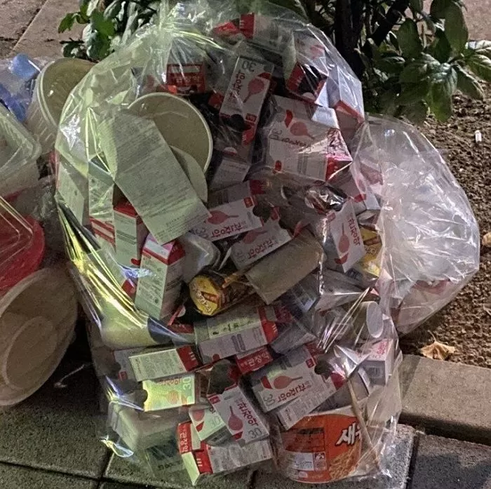 이태원 거리에서 발견된 투명 쓰레기 봉지 안에는 빈 관장약 상자로 가득했다.