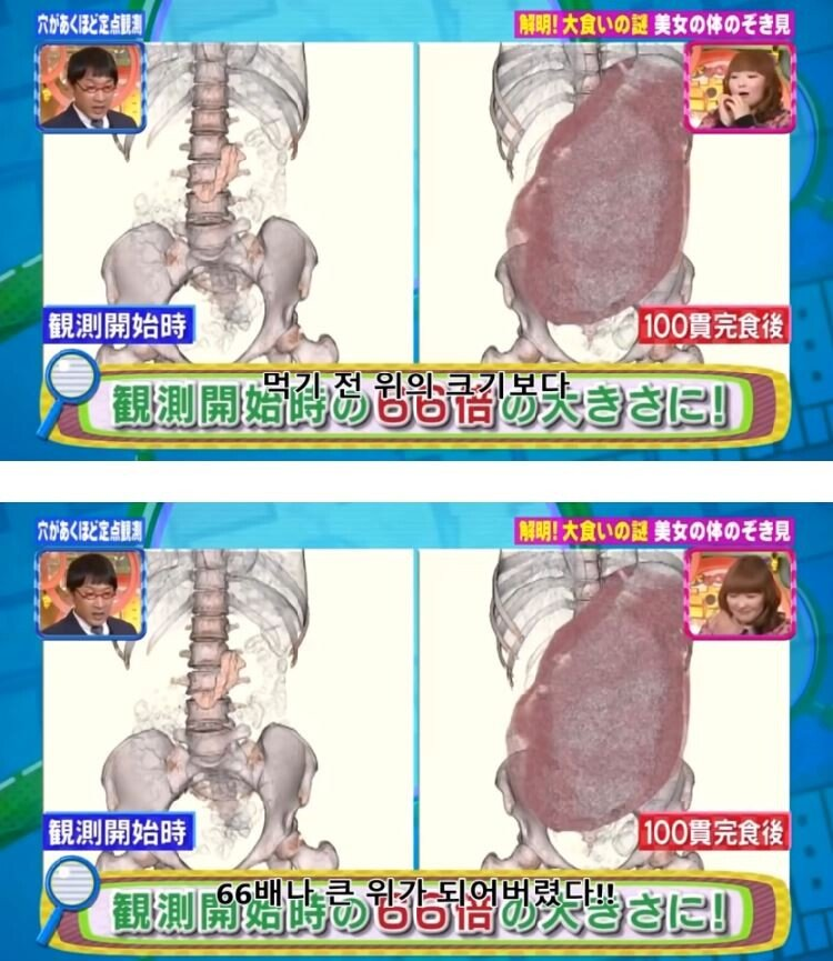 놀라운 먹방이 끝난 후 CT 촬영 결과는 매우 놀라웠다. 먹기 전 위의 크기보다 66배 늘어난 것.