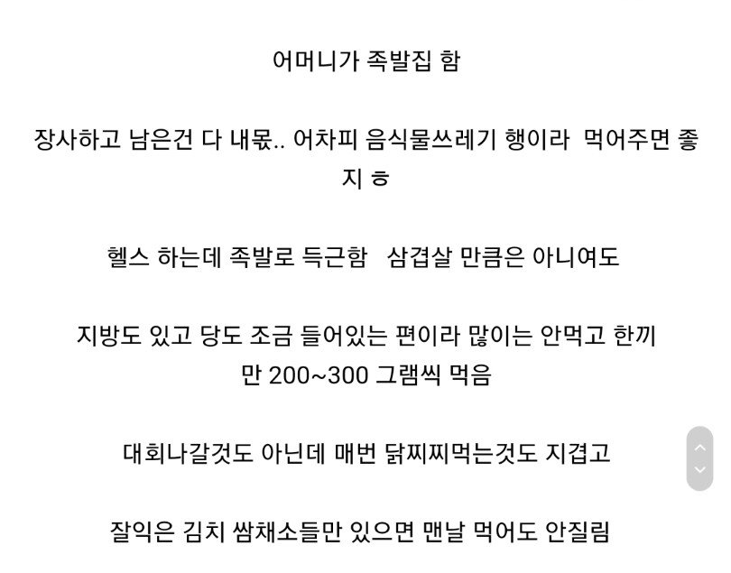 이어 “헬스 하는데 족발로 득근했다. 삼겹살 만큼은 아니여도 지방도 있고 당도 조금 들어있는 편이라 많이는 안 먹고 한 끼만 200~300g씩 먹는다”고 설명했다.
