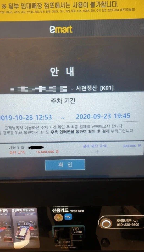 해당 게시글에는 이마트의 주차장 무인정산 기기 화면을 촬영한 사진이 첨부돼 있다. 해당 차량의 운전자는 지난 2019년 10월 28일부터 2020년 9월 23일까지 주차를 한 것으로 보인다. 지난해 주차한 차량을 1년이 지나서 찾으러 온 것.