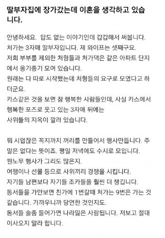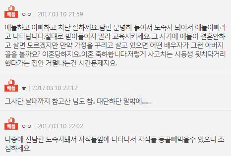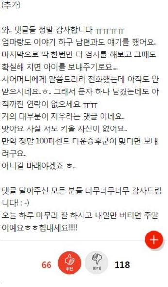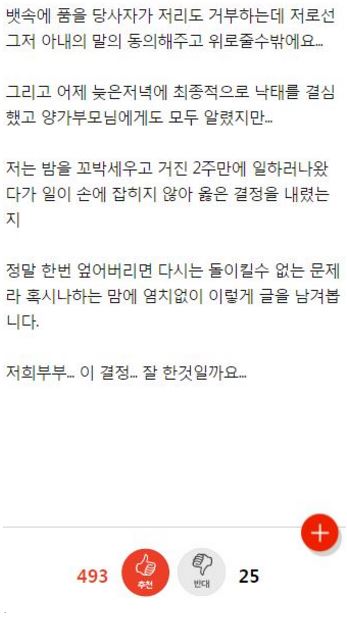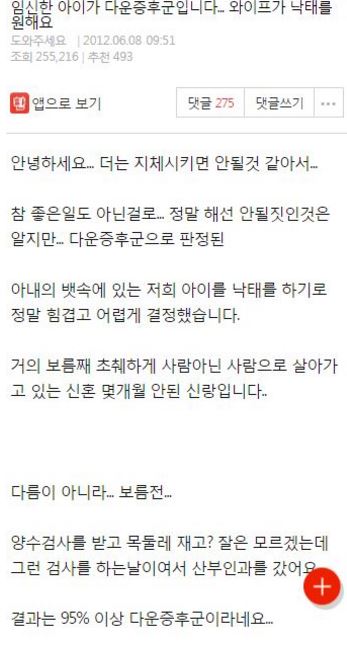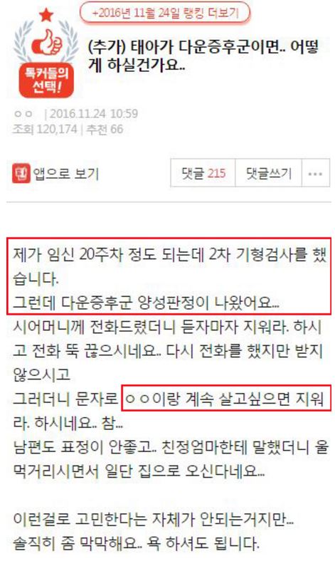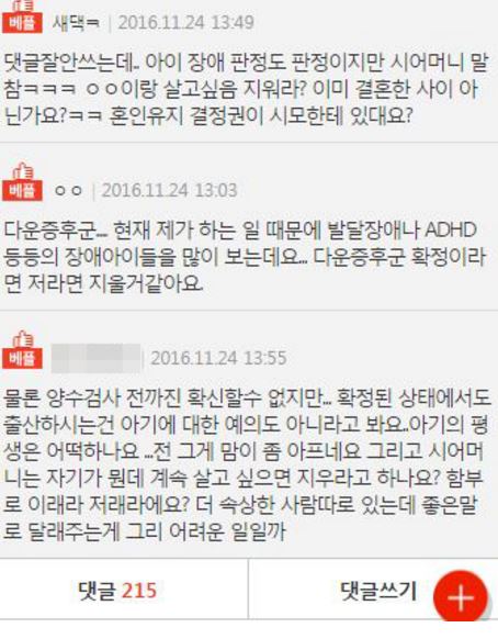 “태아가 다운증후군이면 어떻게 하실건가요?” ADVERTISEMENT 온라인 커뮤니티 +) 다운증후군 아이를 갖게 된 부부의 사연 ADVERTISEMENT ADVERTISEMENT 온라인 커뮤니티 +) 시어머니 유언덕분에 이혼했어요 ADVERTISEMENT ADVERTISEMENT 온라인 커뮤니티 +) 딸부잣집에 장가 갔는데 이혼을 생각하고 있습니다 ADVERTISEMENT ADVERTISEMENT