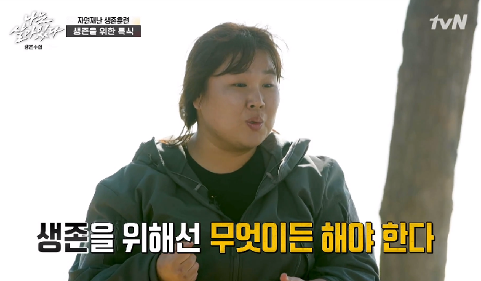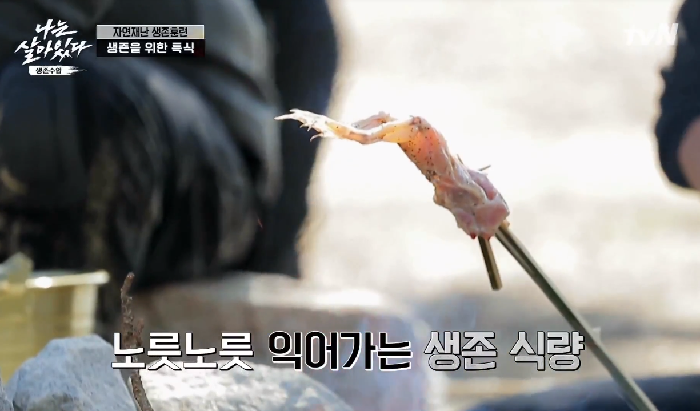 훈련이 끝난 후 생존을 위한 특식으로 황소개구리 구이가 나왔다. 김민경은 “생존이라는 거 자체가 살아야 된다는 거 아니냐. 안 먹고 살 수는 없으니까 너무 배고프면 흙도 파먹고 할 정도니까 개구리 먹는 거는 뭐…”라고 말했다.