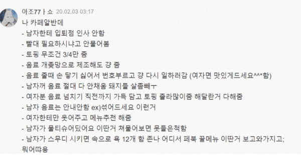 한 카페가 페미니스트를 받지 않겠다고 발언을 해 논란이 된 상황.