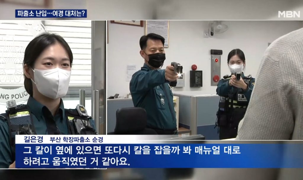 부산 사상경찰서 학장파출소에서 근무하는 20대 새내기 여경이 흉기 든 40대 남성이 대뜸 파출소 안으로 들어오자 대응한 영상이 알려져 화제다.