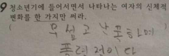 초등학교 시험문제에 “청소년기에 들어서면서 나타나는 여자의 신체적 변화를 한 가지만 쓰시오”라는 문제였다.