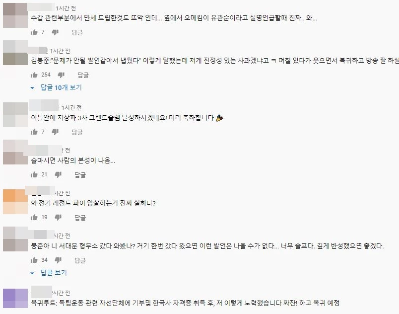 현재 각종 온라인 커뮤니티에는 봉준의 유관순 열사에 관한 언급에 대한 글이 올라와 화제가 되고 있는 상황이다.